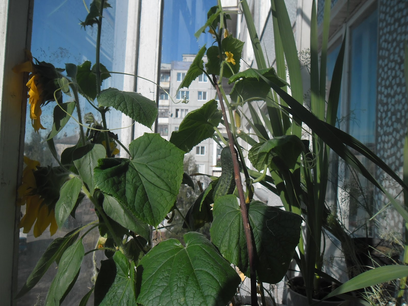 Поэтому у меня есть огород на балконе. Там растут и лук и укроп, и подсолнухи (самосев) и огурцы. Спасибо соседке, поливает!