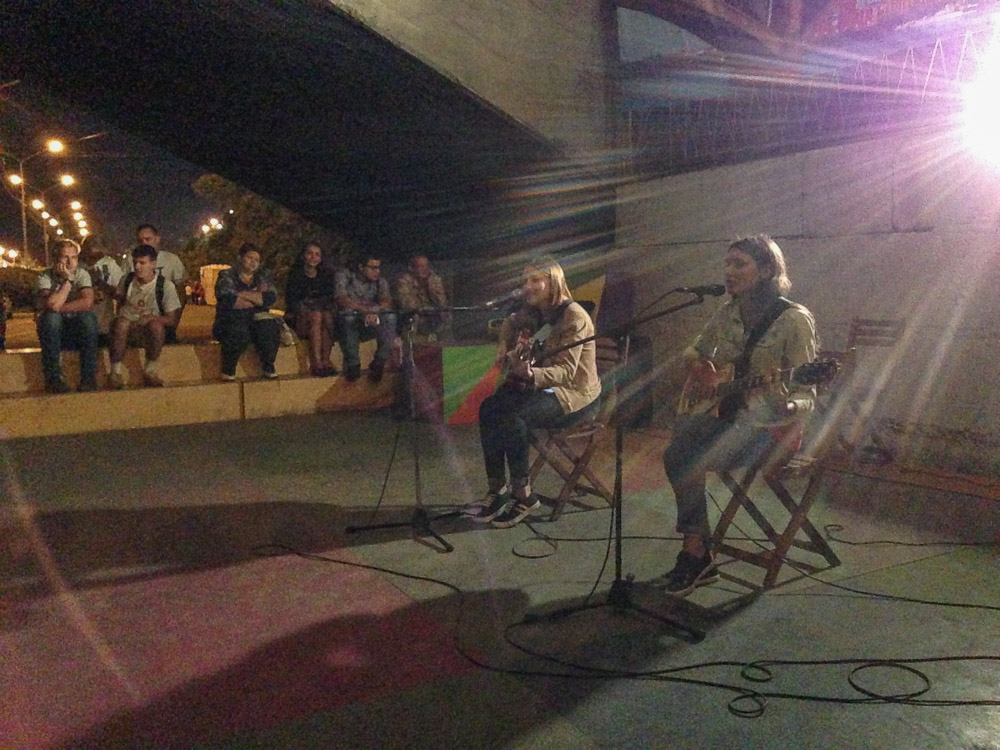 Выйдя гулять по городу дальше натыкаюсь на фестиваль "Арт-берег" на набережной под мостом. И так удачно натыкаюсь, прям во время свободного микрофона. Записывайся, жди очереди(пьяного дядечку, порывавшегося исполнить песню о любви без очереди, аккуратно, но быстро вытолкали взашей), выходи и выступай.