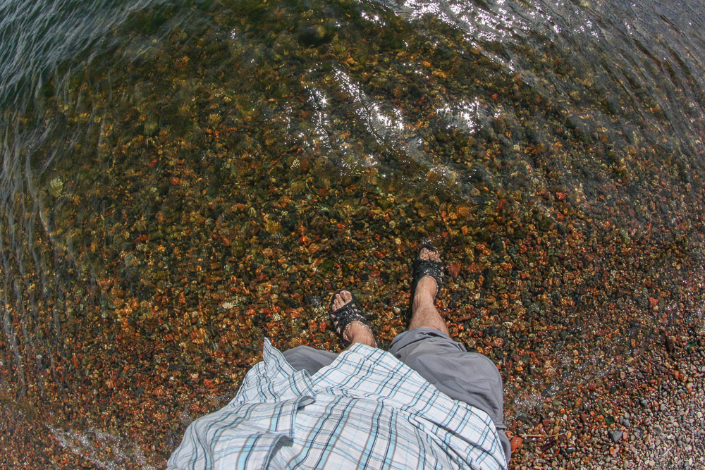 Вижу набережную. Красноярск, как и многие города, расположен на двух берегах реки. В случае с Красноярском - это Енисей. Что делает Влад, если видит новую реку? Идет мочить ноги! Спуск к воде, который вроде есть, а вроде и нет.