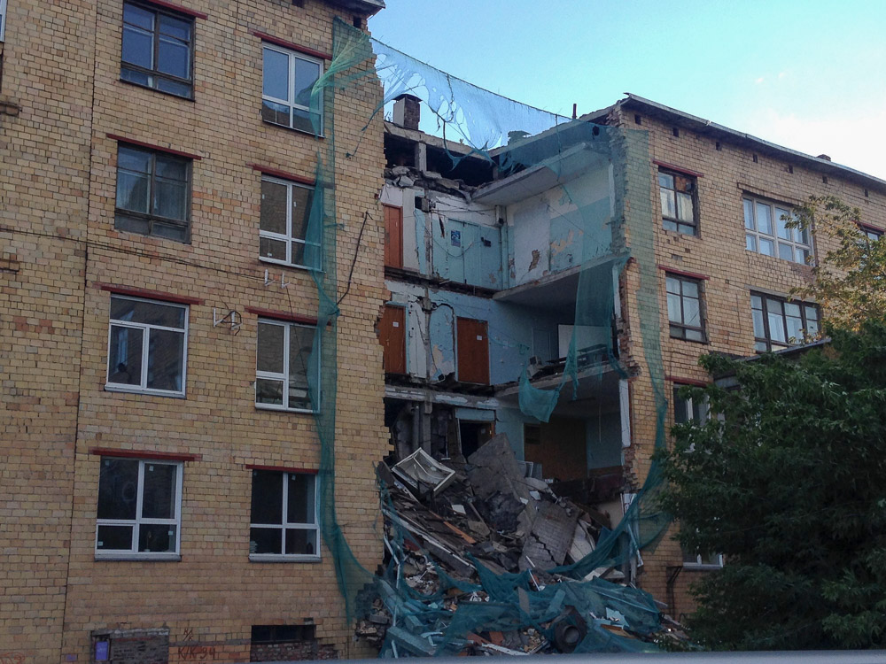 Замечаю симпатичные разрушенный корпус какого-то университета. Что случилось, интересно? Так ровненько обвалился.
