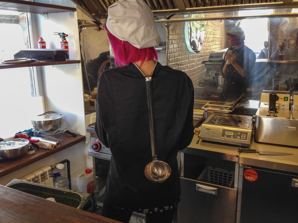 Интересно, дизайнеры просто набрали в гугле "черт" или что-то типа того, или они знали, что размещают на вывеске? В общем, как человек, который три года прожил с FreeBSD на ноутбуке, я не смог пройти мимо и купил там шаурму. Это была самая большая шаурма в моей жизни. Не самая вкусная, но вот самая большая — точно.