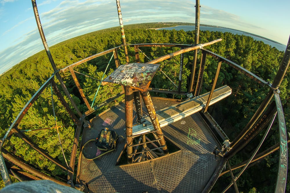 Как - не представляю. Я на площадку забрался, и уже немного страшновато - высоко, ветер, под тобой верхушки сосен, и ты видишь как их качает ветром. Качает ветром и вышку вместе с тобой. Но зато виды... захватывает дух и хочется смеяться от счастья.