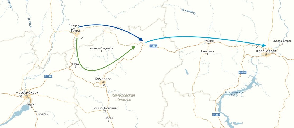 Мы решили не тратить время на возвращение из Томска на основную трассу(зеленая стрелочка), а поехали по дороге, которая соединяет Томск и Красноярск напрямую(синяя и голубая стрелки), хоть нас и предупреждали, что часть этой трассы плохая и там малый трафик(там, где синяя стрелка)
