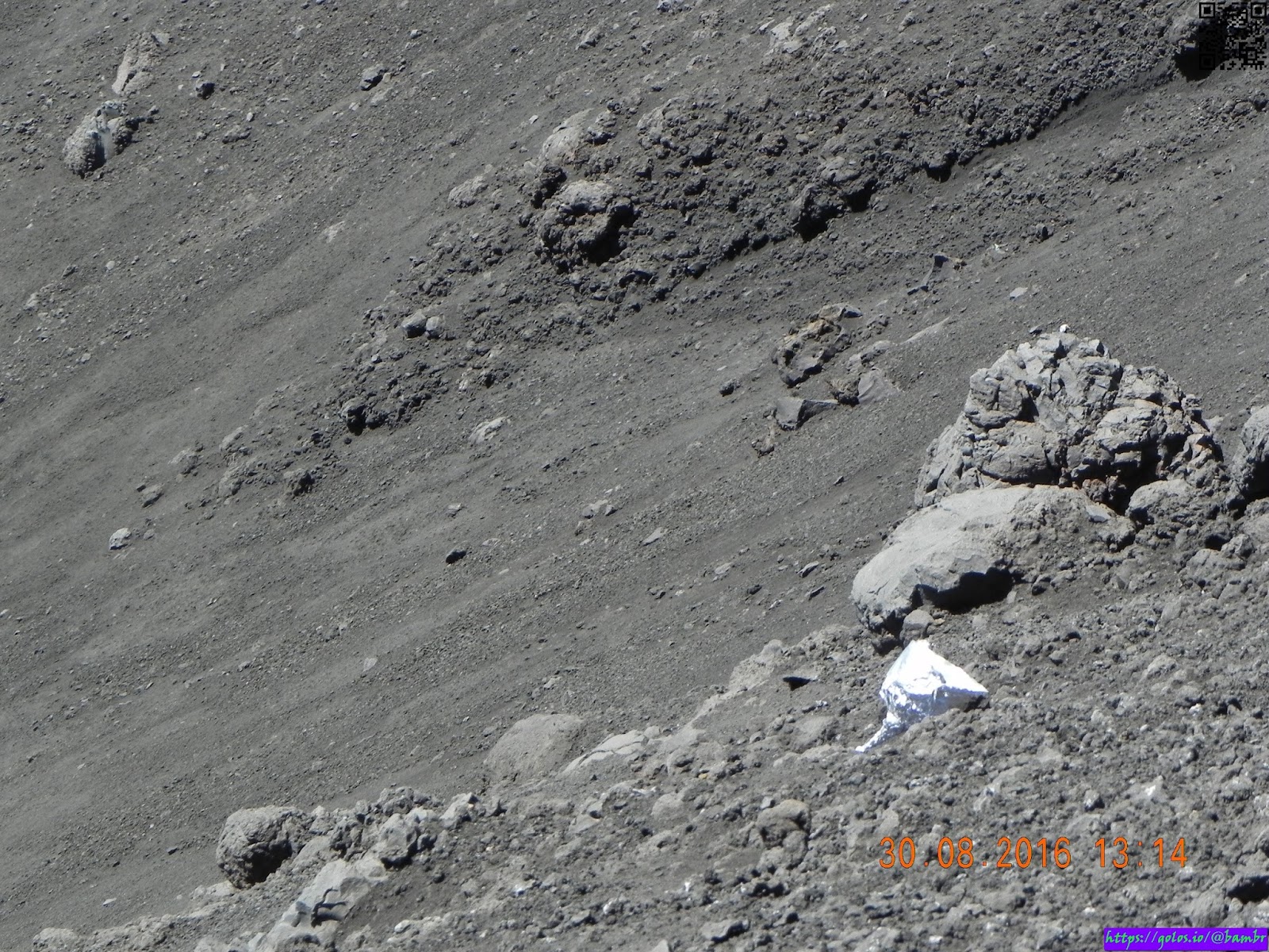 Этот блестящий кулек из фольги недавно был самодельной "шапочкой космонавта" одного из группы детей, вовлеченных аниматорами в вв игру с покорением других планет. Ветер сильный шапочки по сдувал с детских голов и они теперь катаются туда-сюда по воле ветра в жерле вулкана.