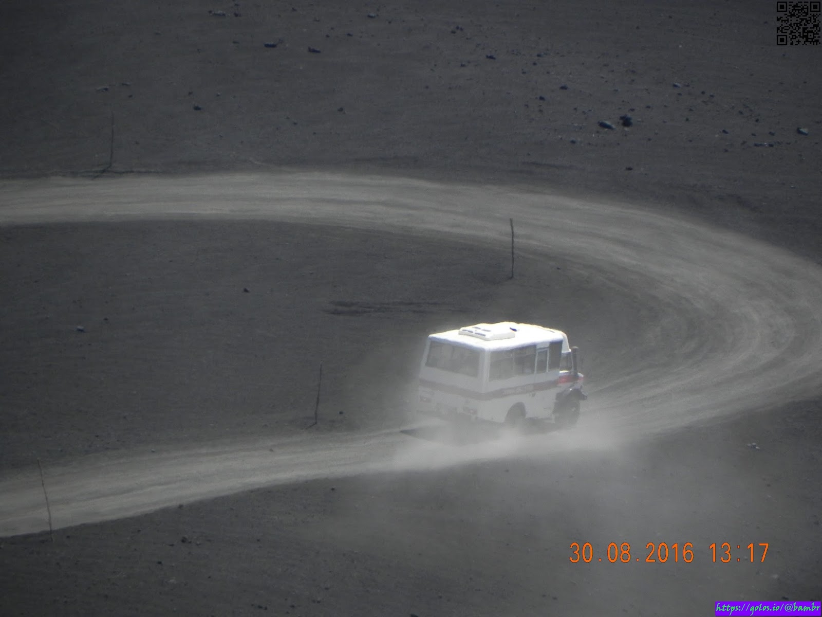 А это дорога, по которой "джипы" возят туристов к жерлу. Отсюда не кажется что склон крутой, однако, когда сидишь в автобусе, в безопасности себя не чувствуешь. Понимание того что если сейчас, по како-то причине, покатится назад, покатится он до самого низа и в конце склона от него не останется ничего.