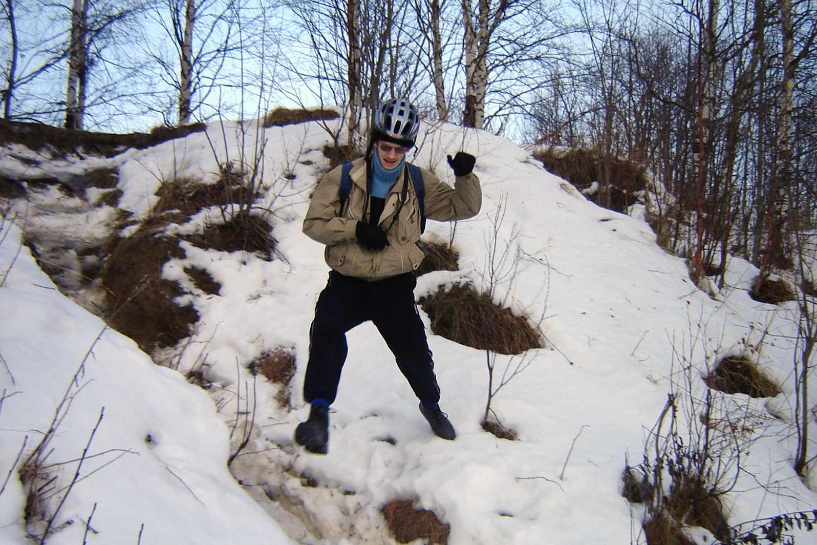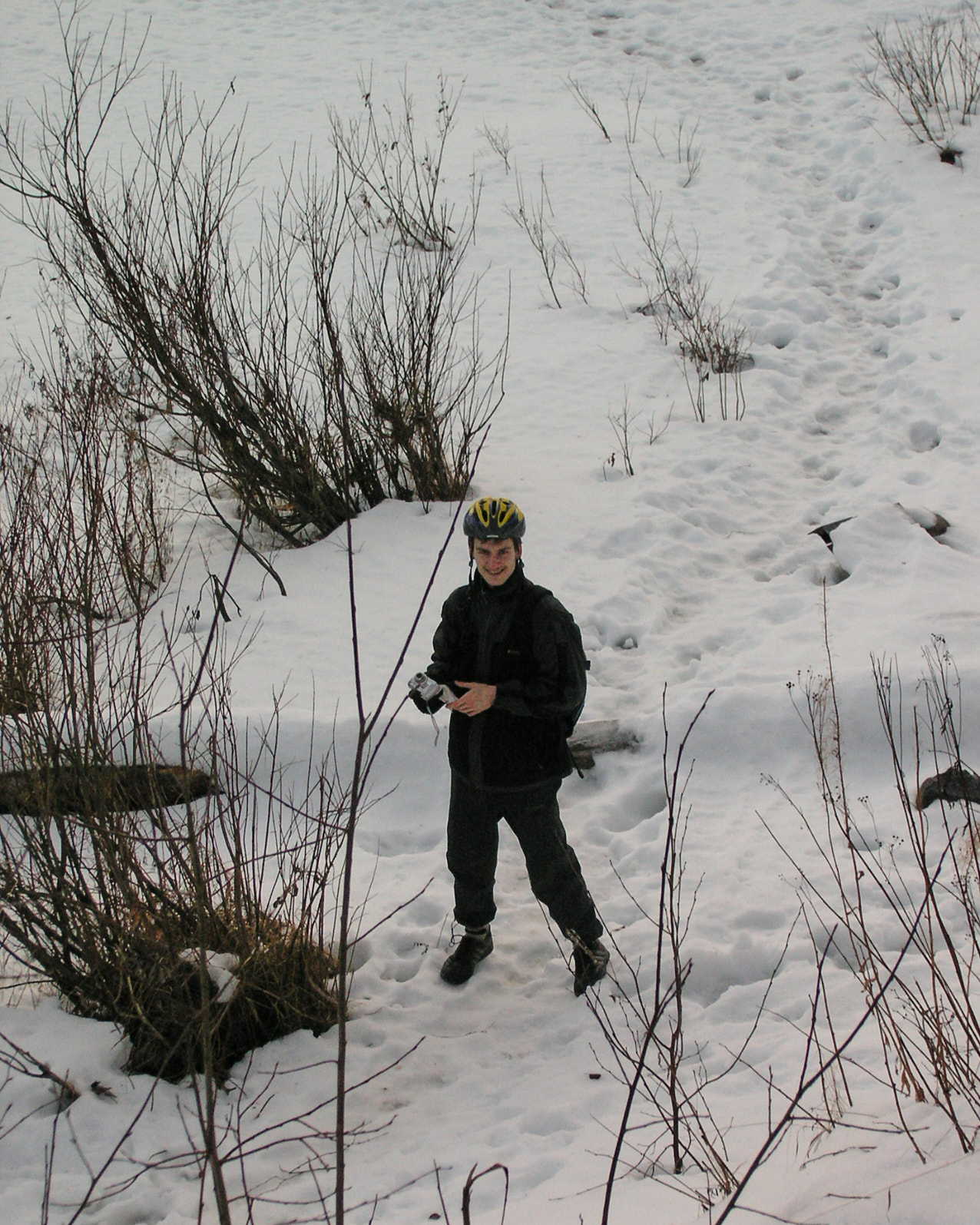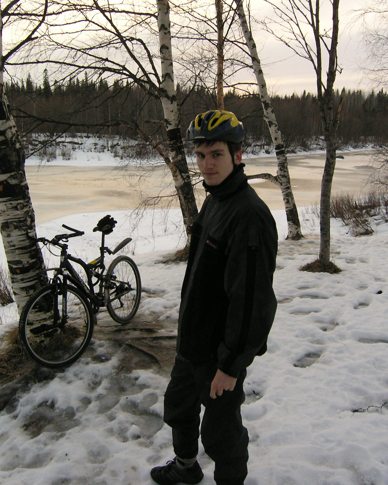 Было некоторое беспокойство за судьбу великов — т.к. на остановке тусовался народ, ждавший автобуса. Но поскольку запасливый Океаныч прихватил с собой велозамок с полутораметровым тросом, велики были благополучно пристёгнуты к походящей осинке, и начался весьма экстремальный спуск к реке.