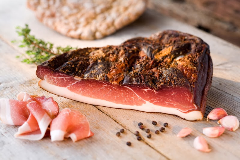 Другой популярный деликатес Италии – это Speck Tirolese/ Спек тиролезе – сырокопченый бекон из южного Тироля, уже знакомой нам горной провинции Трентино-Альто-Адидже. Большой кусок свиного бедра с кожей сначала вялится, а затем ещё и коптится. При засолке в состав смеси к соли, специям и горным травам добавляется можжевельник и розмарин для придания ярко-выраженного пряного запаха. Созревание деликатеса после первой сушки происходит в течение минимум полугода, а после копчения приобретает приятный привкус с дымком.