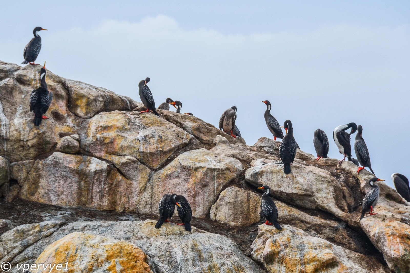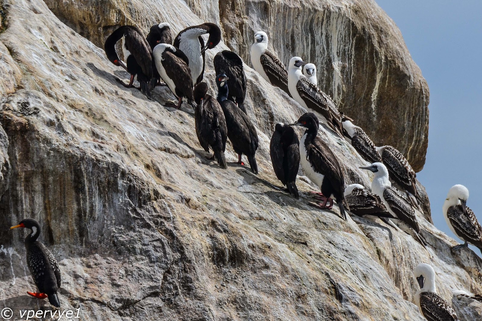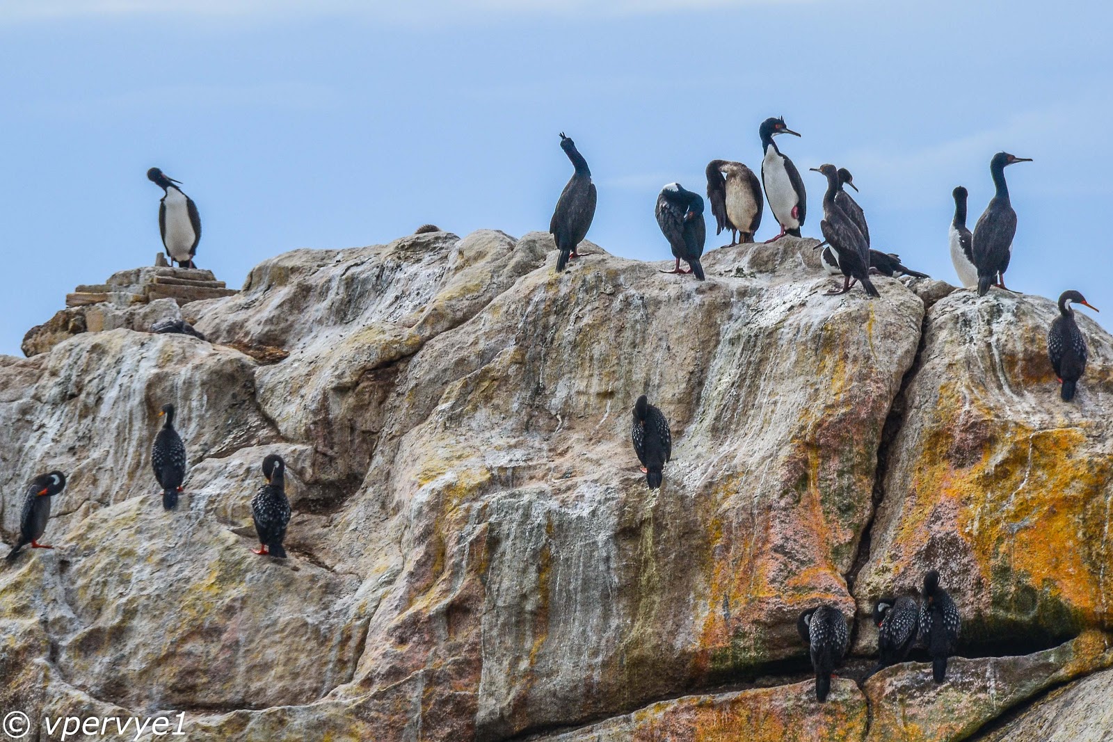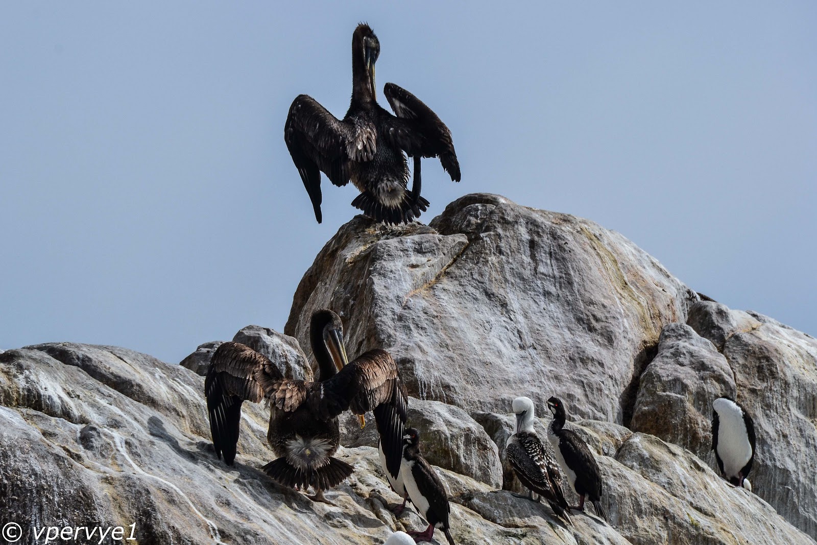 С белой грудкой похожи на корморана де рокас или имперского. Но у первых белое пятно до шеи не до ходит и ещё их черношеими в Чили зовут, а y имперских пятно доходит до головы.